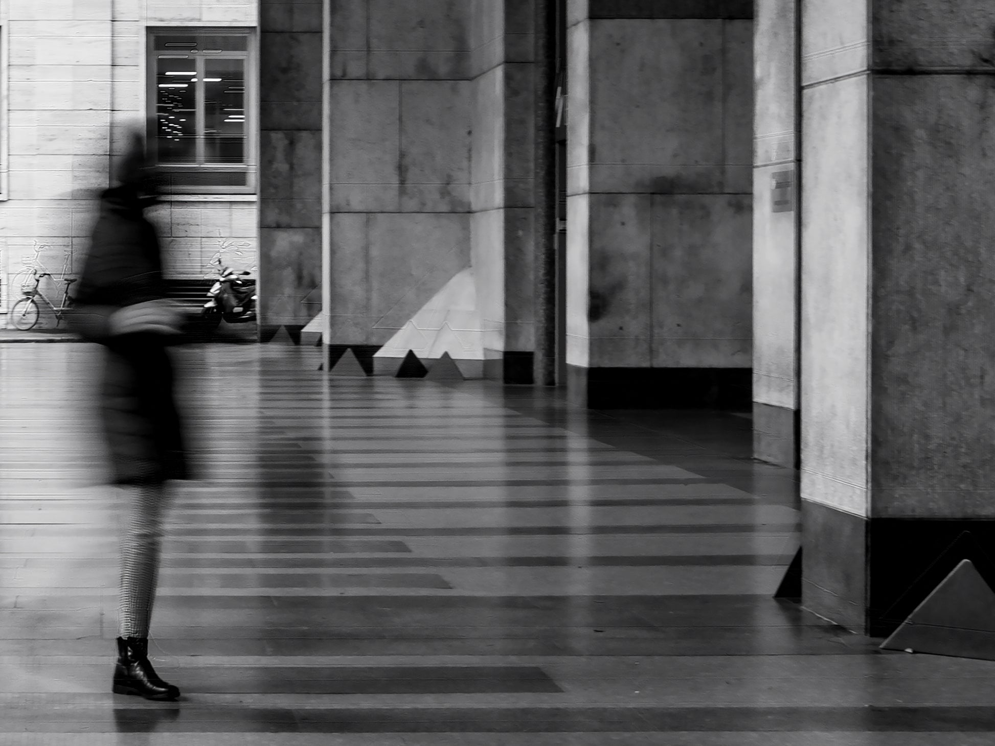 This long-exposure, black-and-white photograph is set within a stately stone colonnade, where the architecture's sharp lines and symmetry create a scene of permanence. Set against this stable environment, a figure’s movement is captured as a fluid, transparent blur. This powerful contrast between the static surroundings and the moving human presence offers a compelling visual meditation on the passage of time.