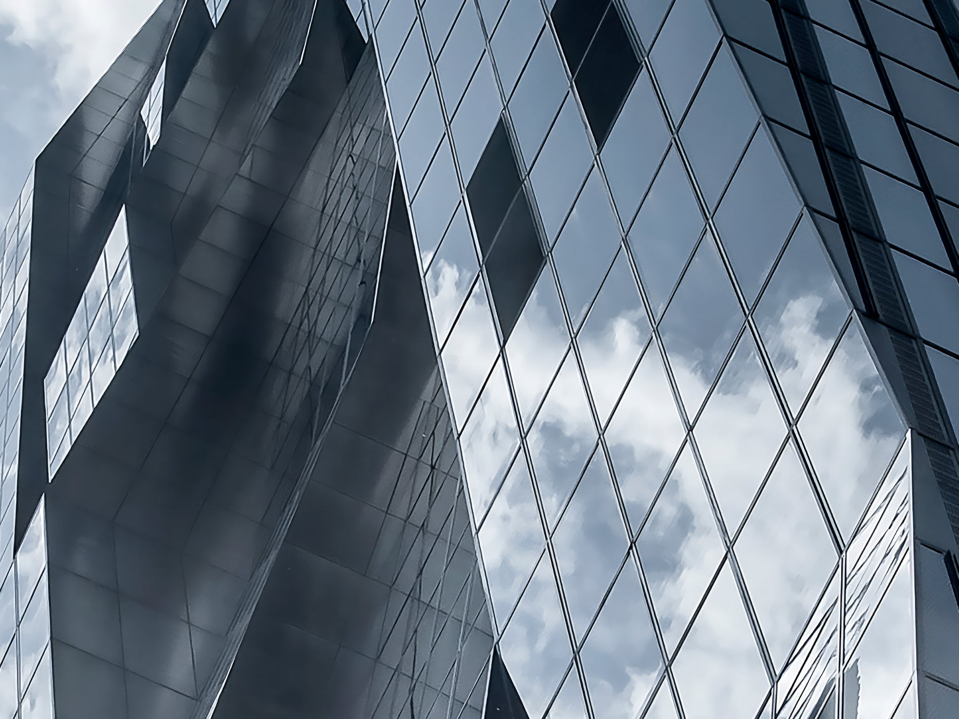 This striking, low-angle photograph captures a modern skyscraper with a dark, reflective facade. Its sharp, geometric lines ascend into a dynamic sky filled with clouds. The sun's brightness creates a distinct lens flare, adding a burst of light to the composition. The building's glass surface beautifully mirrors the sky, creating a compelling interplay between the structure and the natural environment.