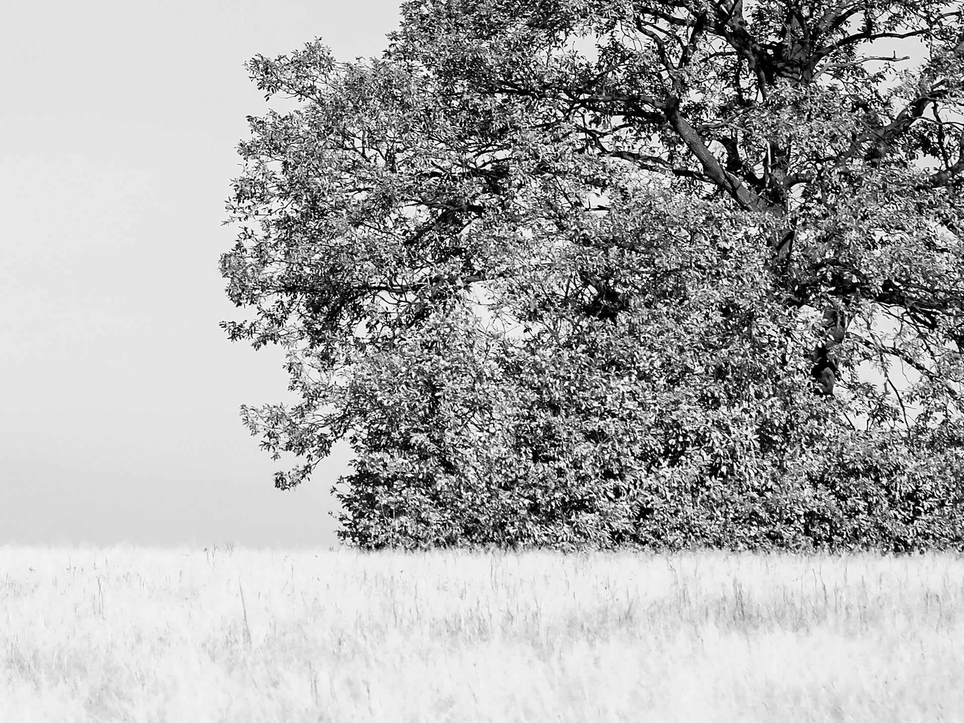 This black-and-white photograph is a meditation on simplicity. A lone, majestic tree stands in an open field, its intricately detailed canopy forming a strong silhouette against a calm, empty sky. The monochrome palette enhances the different textures of the grass and leaves, while the balanced composition creates a powerful sense of peace and solitude.